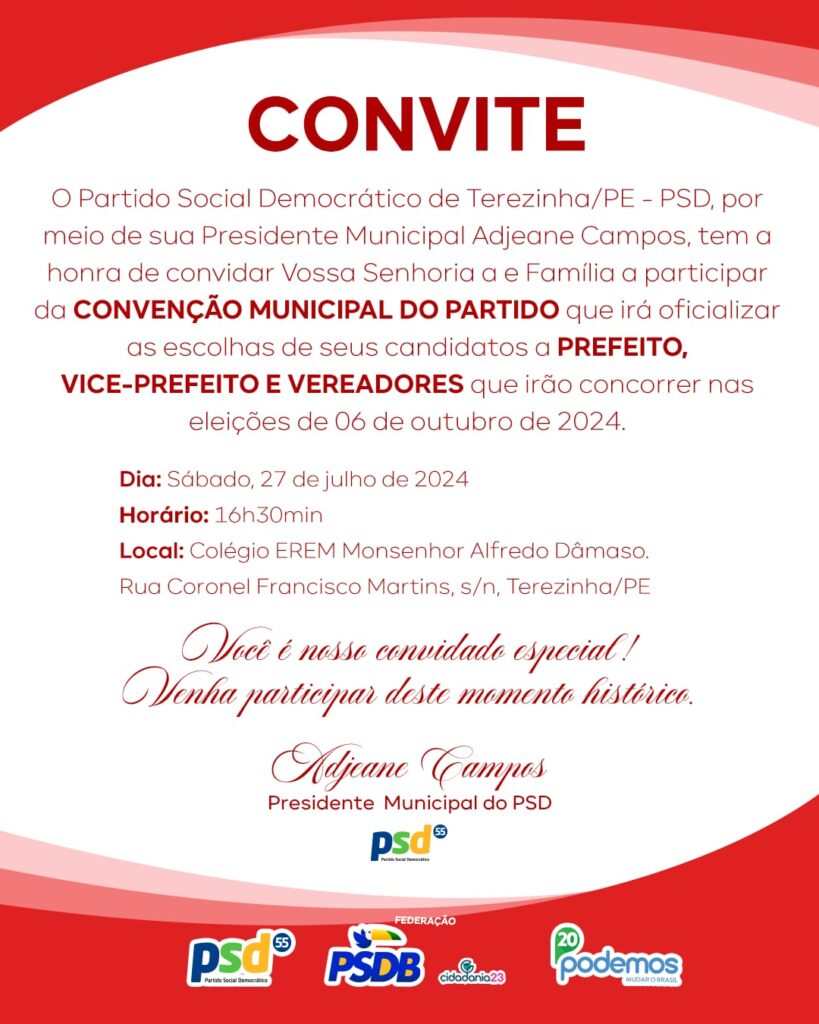 O Partido Social Democrático de Terezinha/PE – PSD, por meio de sua Presidente Municipal Adjeane Campos, tem a honra de convidar toda a população terezinhense para participar da CONVENÇÃO MUNICIPAL DO PARTIDO que irá oficializar as escolhas de seus candidatos a PREFEITO, VICE-PREFEITO E VEREADORES que irão concorrer nas eleições de 06 de outubro de 2024.