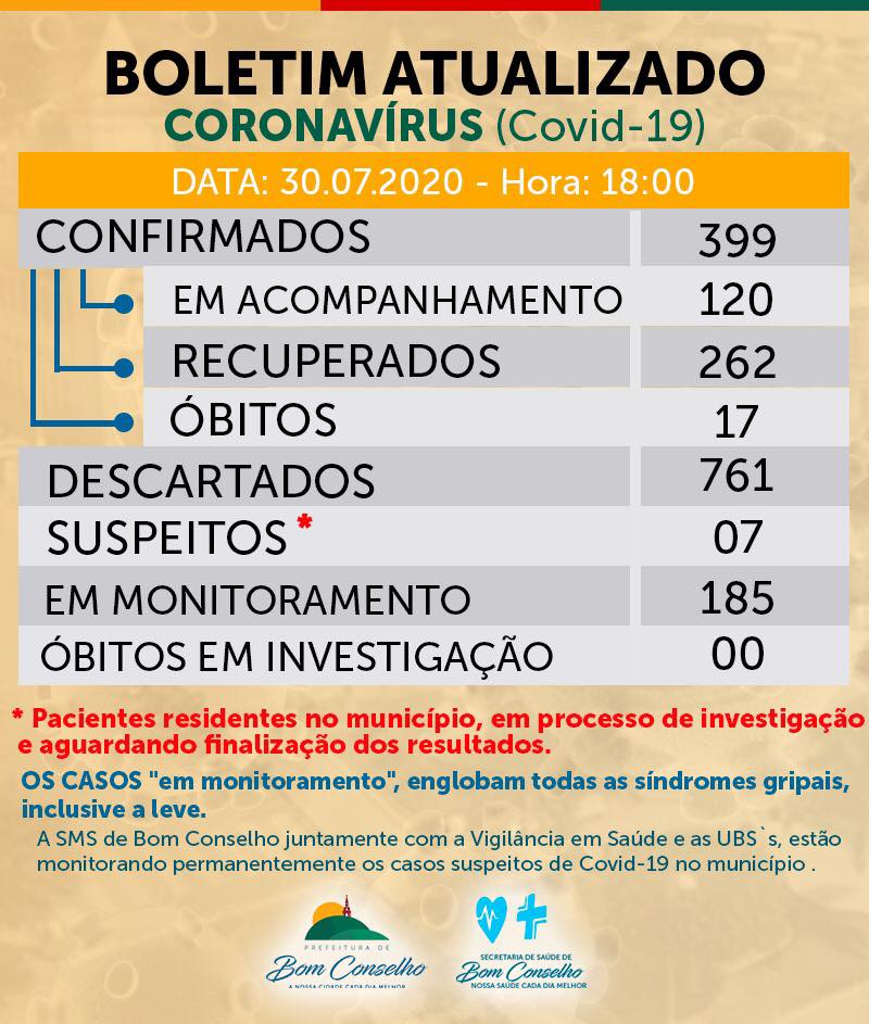 A Secretaria de Saúde de Bom Conselho/PE, informou na noite desta quinta-feira, dia 30 de julho de 2020, que o Município já contabiliza 399 casos confirmados para a COVID-19. Segundo o boletim, deste total, 262 pacientes já estão recuperados, 120 estão em acompanhamento e 17 pessoas vieram a óbito. Ao lado de Águas Belas e Garanhuns, o Município é um dos mais atingidos pelo novo Coronavírus no Agreste Meridional.
