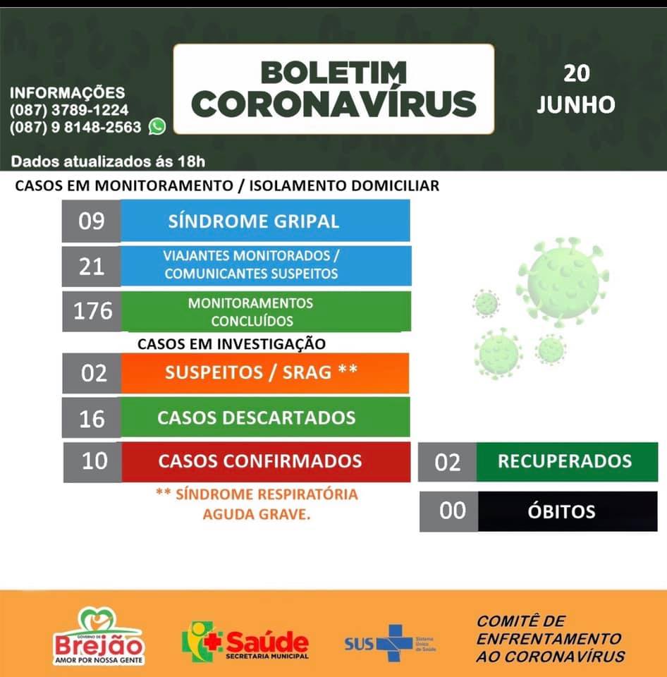 A Prefeitura Municipal de Brejão/PE, confirmou ontem, (20/06), mais um (01) caso testado positivo para o novo Coronavírus. Agora, o Município do Agreste totaliza a marca de 10 casos confirmados para a doença. A Secretaria de Saúde informou ainda, que o paciente esta bem, medicado e cumprindo isolamento domiciliar, conforme recomenda as autoridades de saúde. Além desse, houve também um caso descartado.